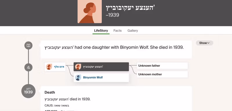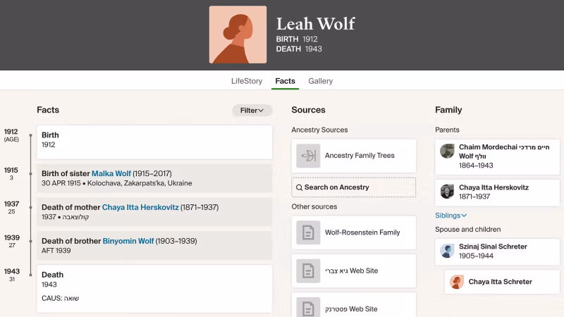 Houve Leah Wolf, morta aos 32 anos no Holocausto; profissão: costureira. Sua mãe, Chaya Itta, também foi morta no Holocausto.